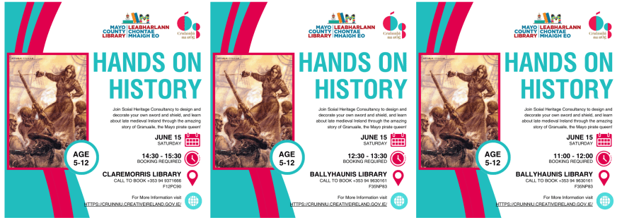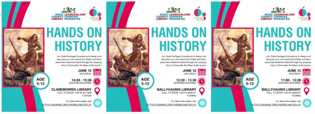 We’re delighted to be back in Mayo Libraries for the return of this year’s Crinniú na nÓg children’s festival on June 15th! We’ll be inviting children to learn about the Mayo pirate queen Gráinne Mhaol, and to design and decorate their own sword and shield! Places for the three workshops are limited, so book now through Ballyhaunis and Claremorris Libraries to secure your free place!