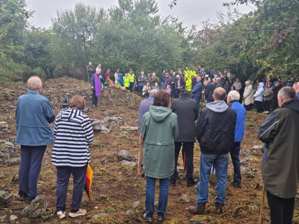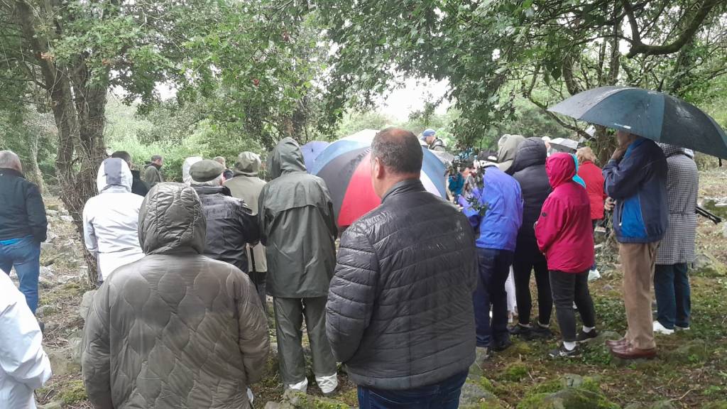 On Friday 22nd August, well over a hundred locals came for a blessing of the graveyard (which was in use by the community up until the twentieth century) and a tour of the important history, archaeology, and ecology preserved there. The parish priest delivered prayers outside of the walls of the former Kilskeagh parish church, dating to the 15th/16th century. The oldest visitors had not been able to access the graveyard for decades, and most of the youngest visitors had been unaware that it had ever existed in the first place. Many members of the community have family members buried in the area – some as close as children and siblings – and it was an emotional and important visit to step foot on the site again and feel that their family had been respected and remembered with the access to and clearance of the site. All of the graves so far (bar one) do not have any grave markers with names or dates, and are simply laid out and marked by limestone slabs and boulders.